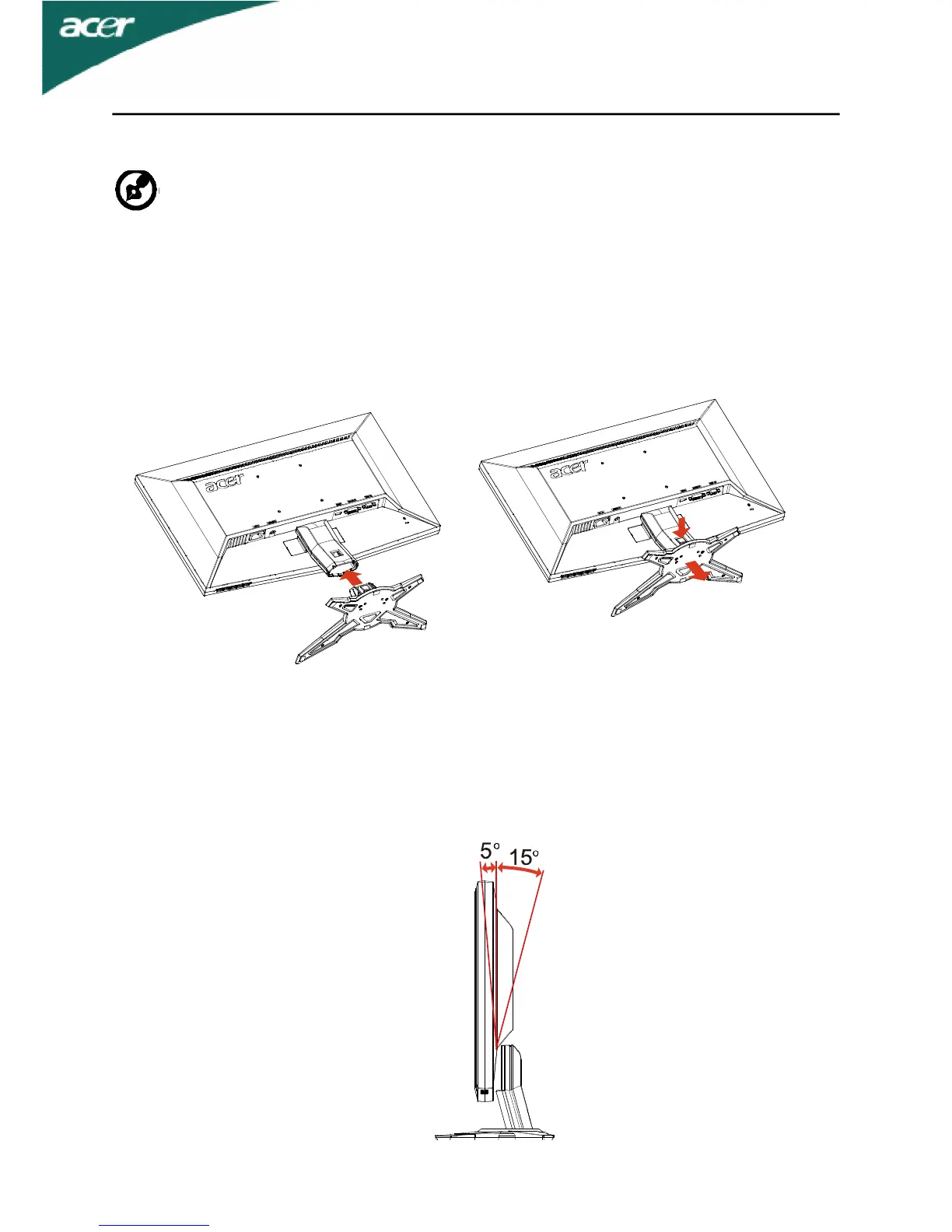 The monitor can be adjusted to 15 degrees up or 5 degrees down as indi-