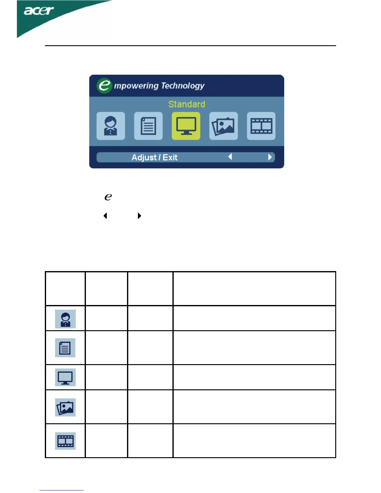 Step 1: Press “ “ Key to open the Acer eColor Management OSD and