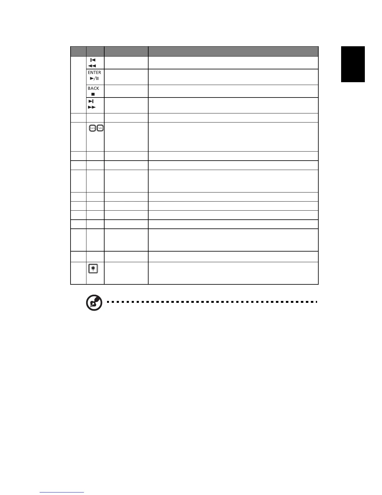 Laser button Aim the remote at the viewing screen, press and hold this