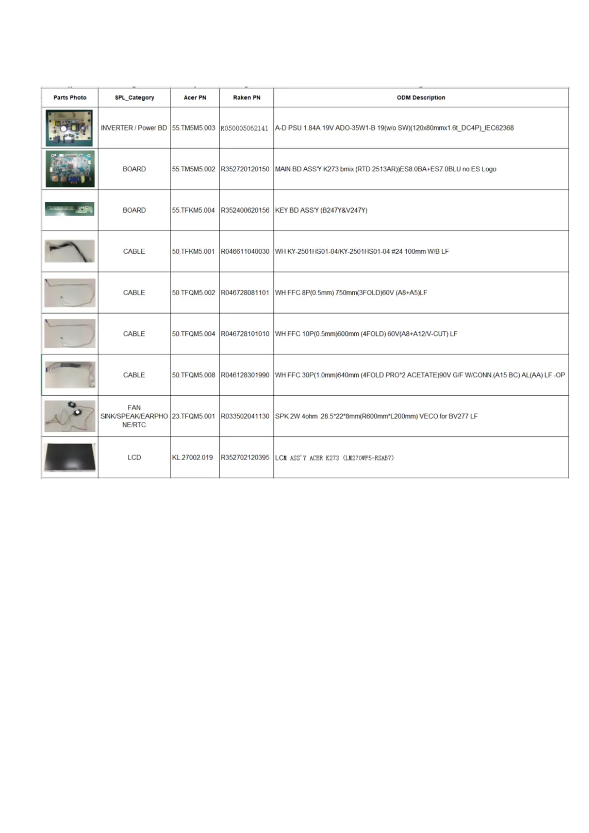 Acer K273 - FRU (Field Replaceable Unit) List