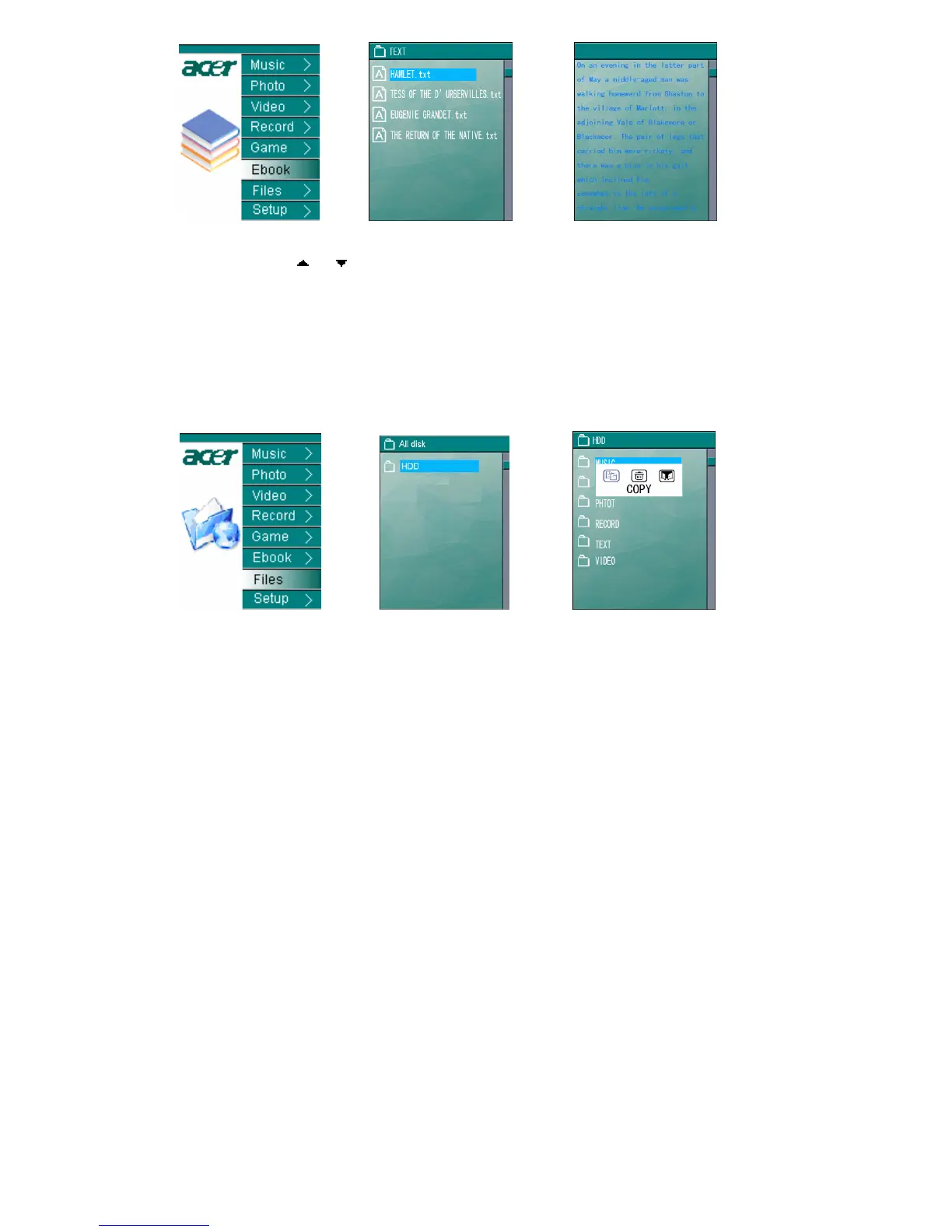 2) Select the desired TXT file and press “ENTER” to the text reading interface, see