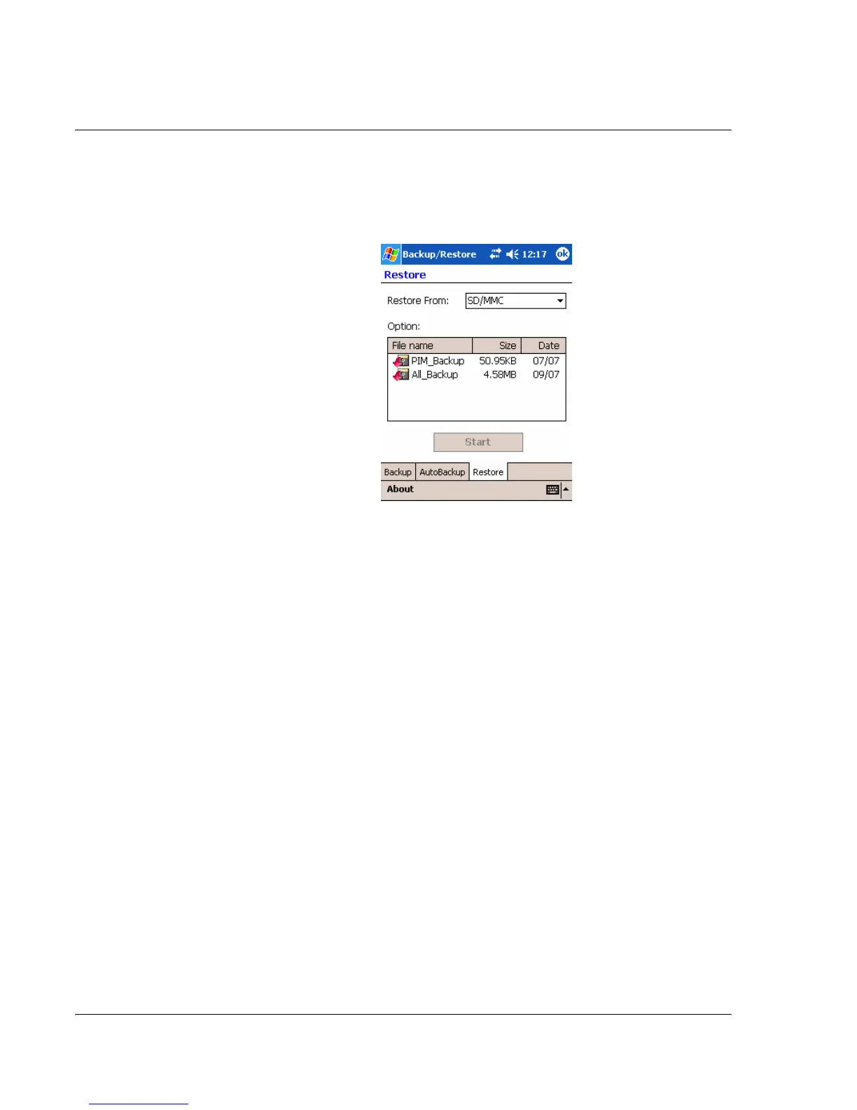 device. Filename, file size and date when the backup file was created are indicated in