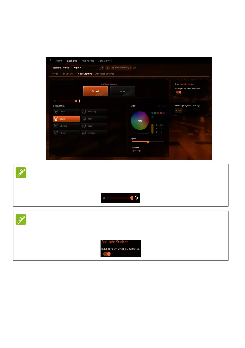 To turn off the lighting effect for the keyboard or for the light bar, slide the