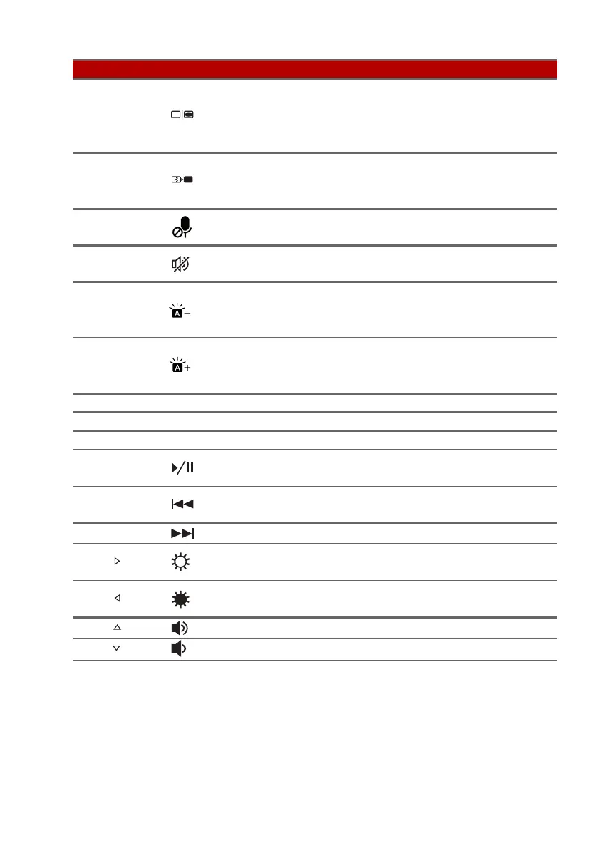 Fn + Volume down Decreases the sound volume.
