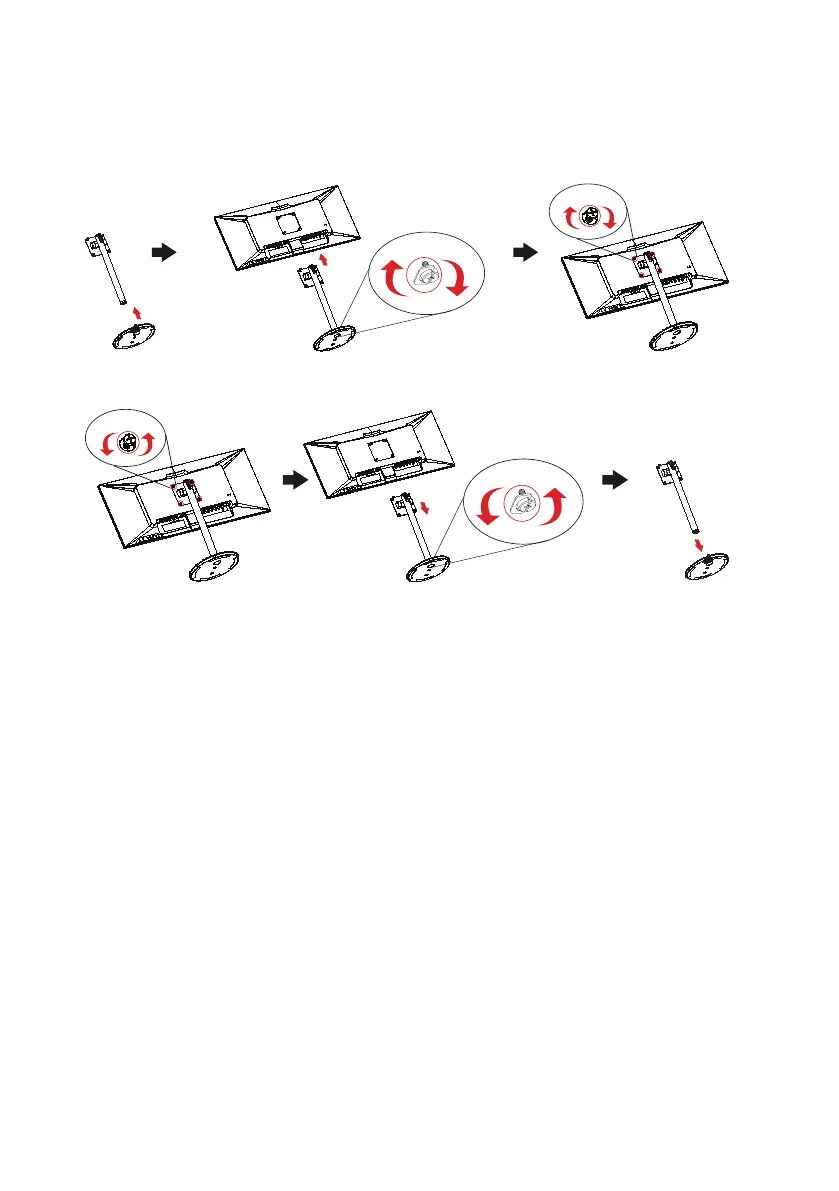 Installation: Align the base with the stand and push the base towards the top of the monitor, and