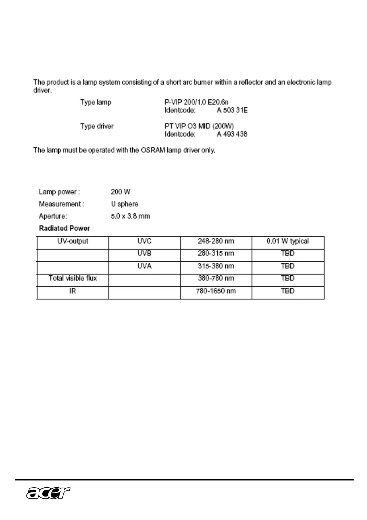 Acer P1165E - Lamp Specifications