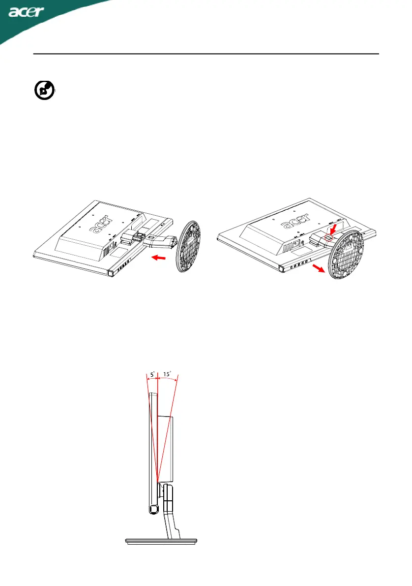 The monitor can be adjusted to 15 degrees up or 5 degrees down as indi-