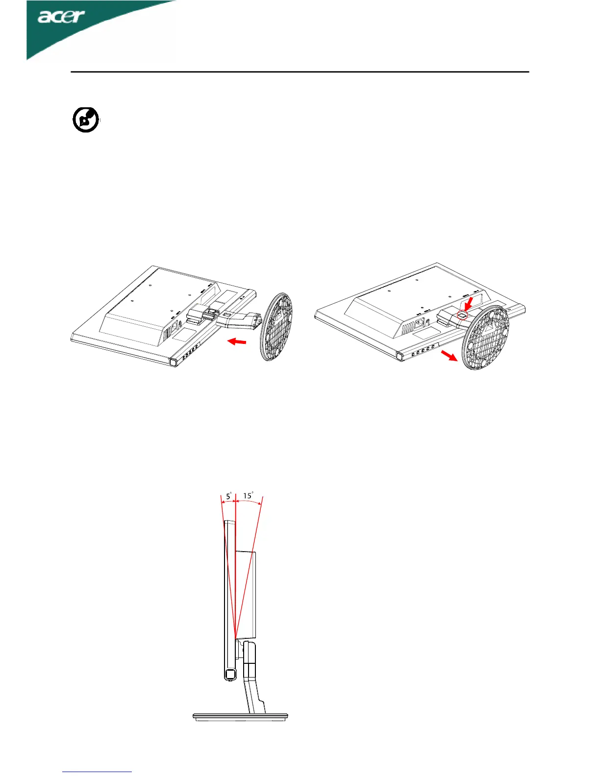The monitor can be adjusted to 15 degrees up or 5 degrees down as indi-