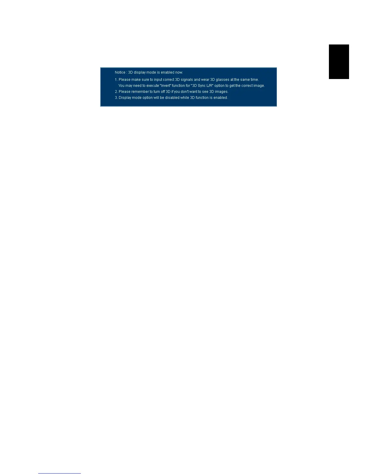 Note: There has reminder screen if 3D still enable when power on projector.