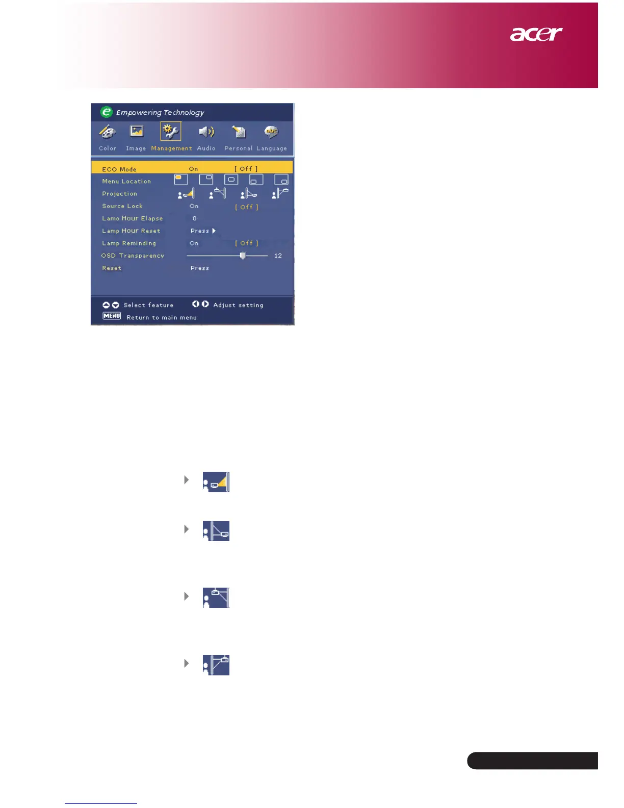 consumption, extend the lamp life and reduce noise. Choose “Off”