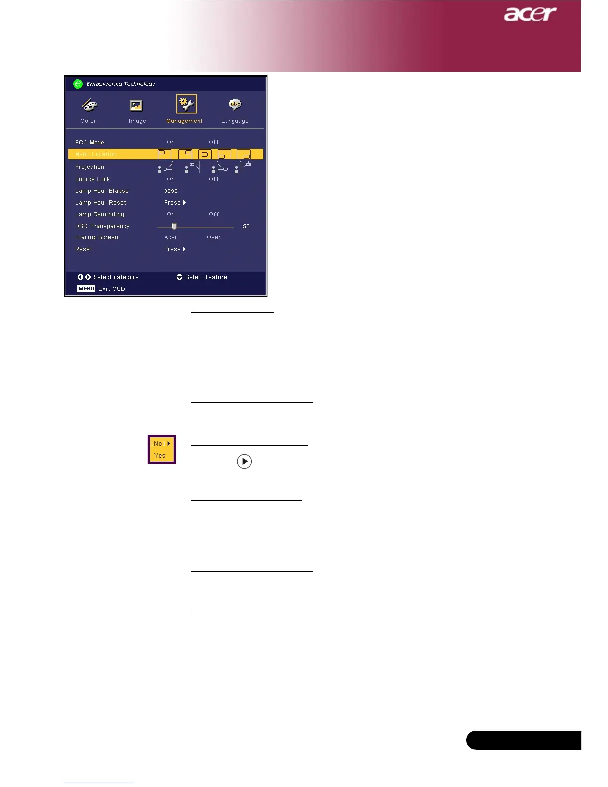 Press the button after choosing “Yes ”to turn the lamp hour