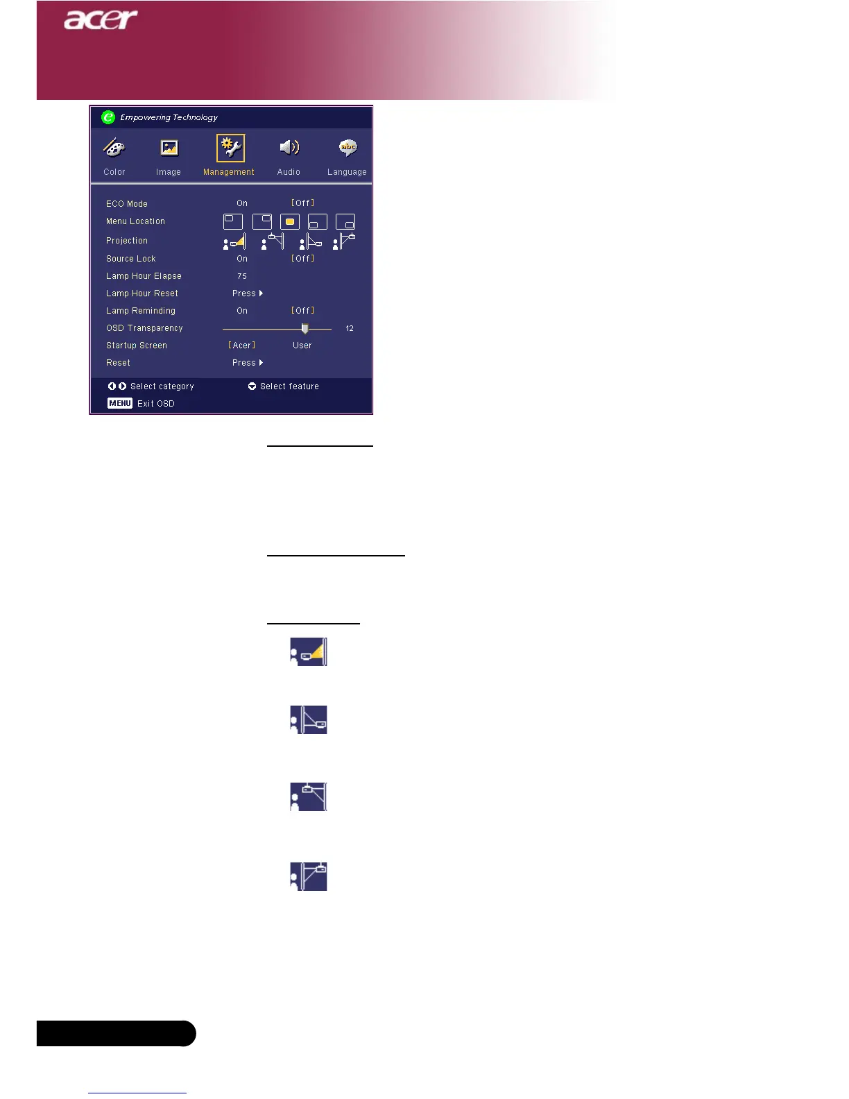 consumption, extend the lamp life and reduce noise. Choose ”Off”