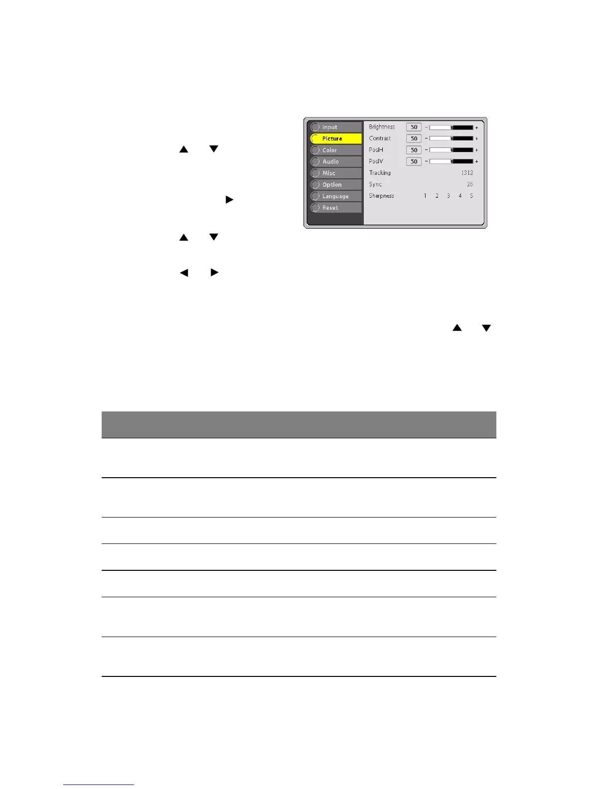 Tracking Adjusts the horizontal pixel of the image.