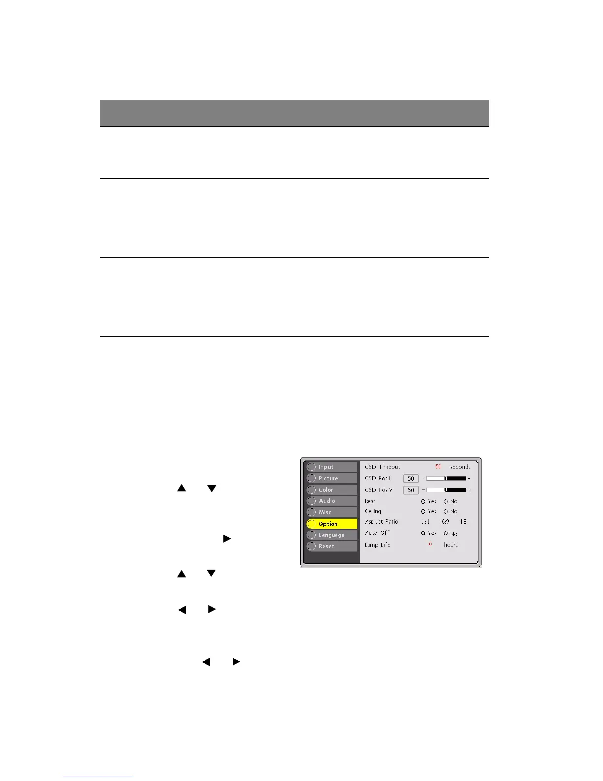 • On the Rear, Ceiling, Aspect Ratio and Auto Off sub-menus,