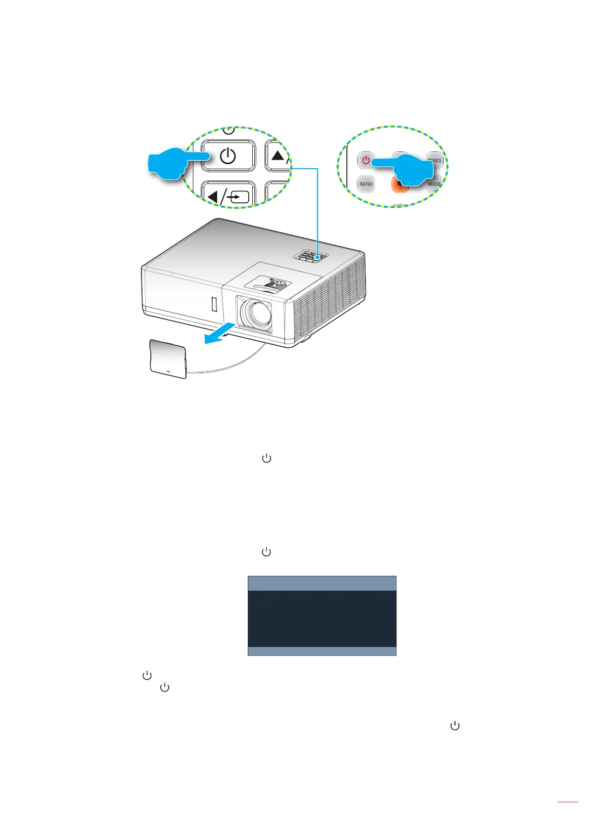 3. Turn on the projector by pressing the button on the projector keypad or remote control.