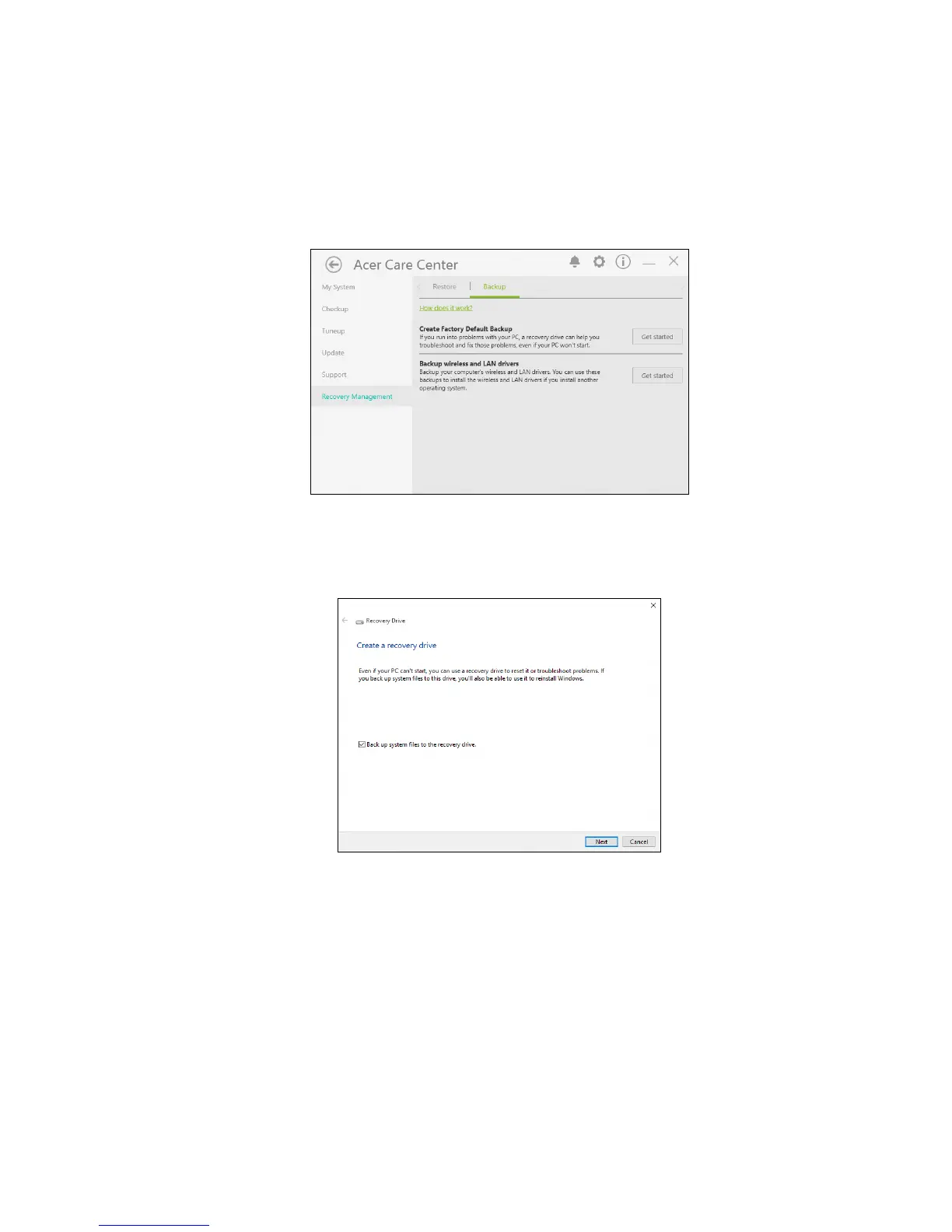 'Recovery' in the Cortana search box and then select Acer