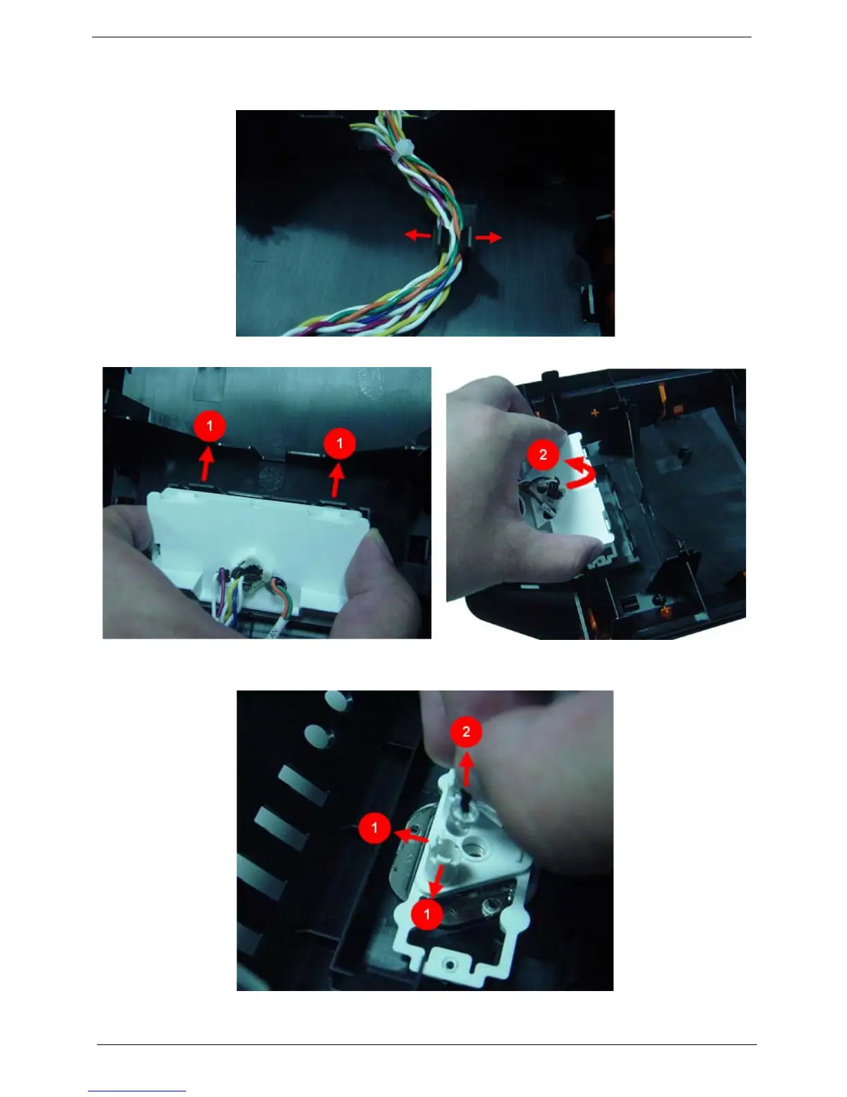 2. Release the two locking tabs (1) and gently take out the power switch and LED cable assemble(2).