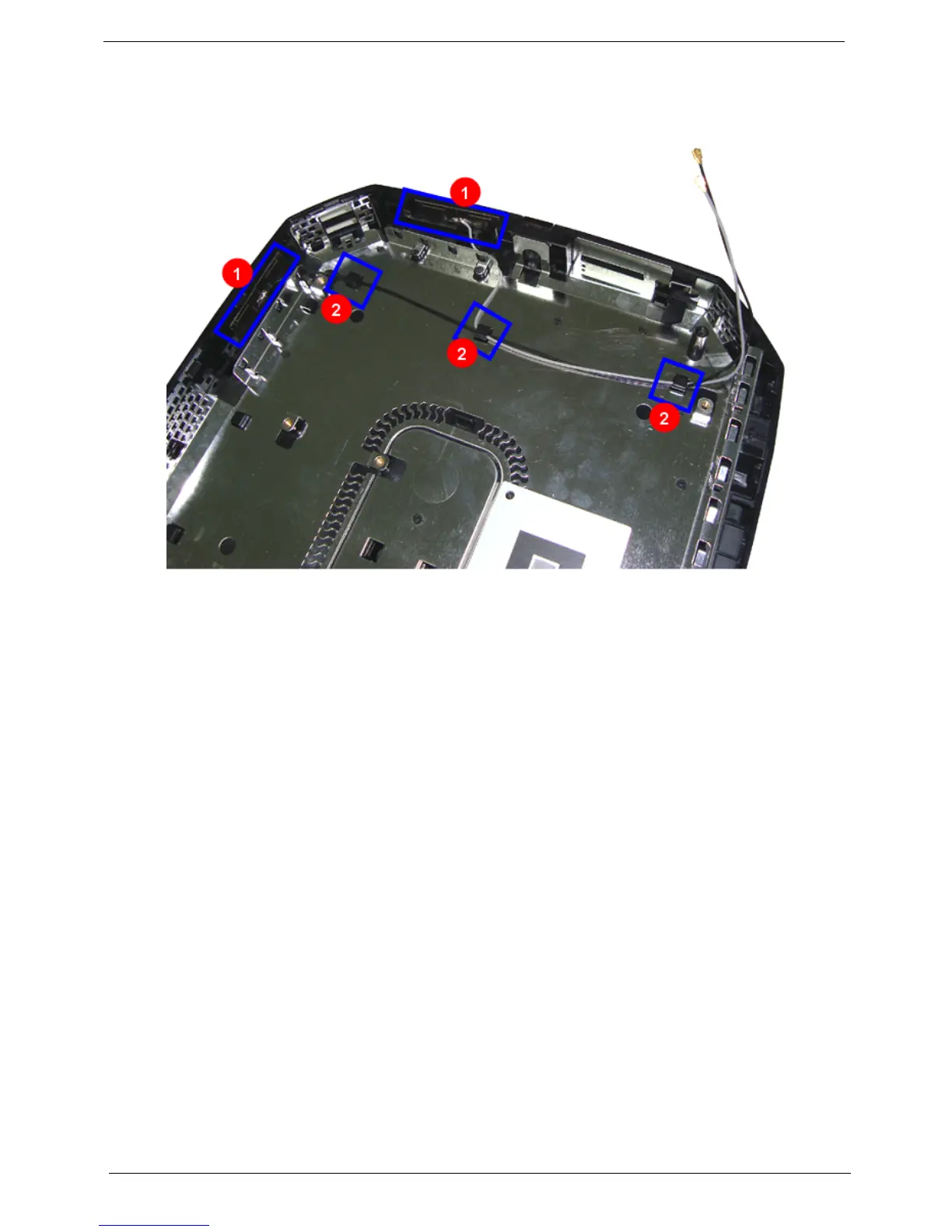 1. Paste the WLAN antennas cable to the chassis(1), and install the WLAN antennas cable into the plastic