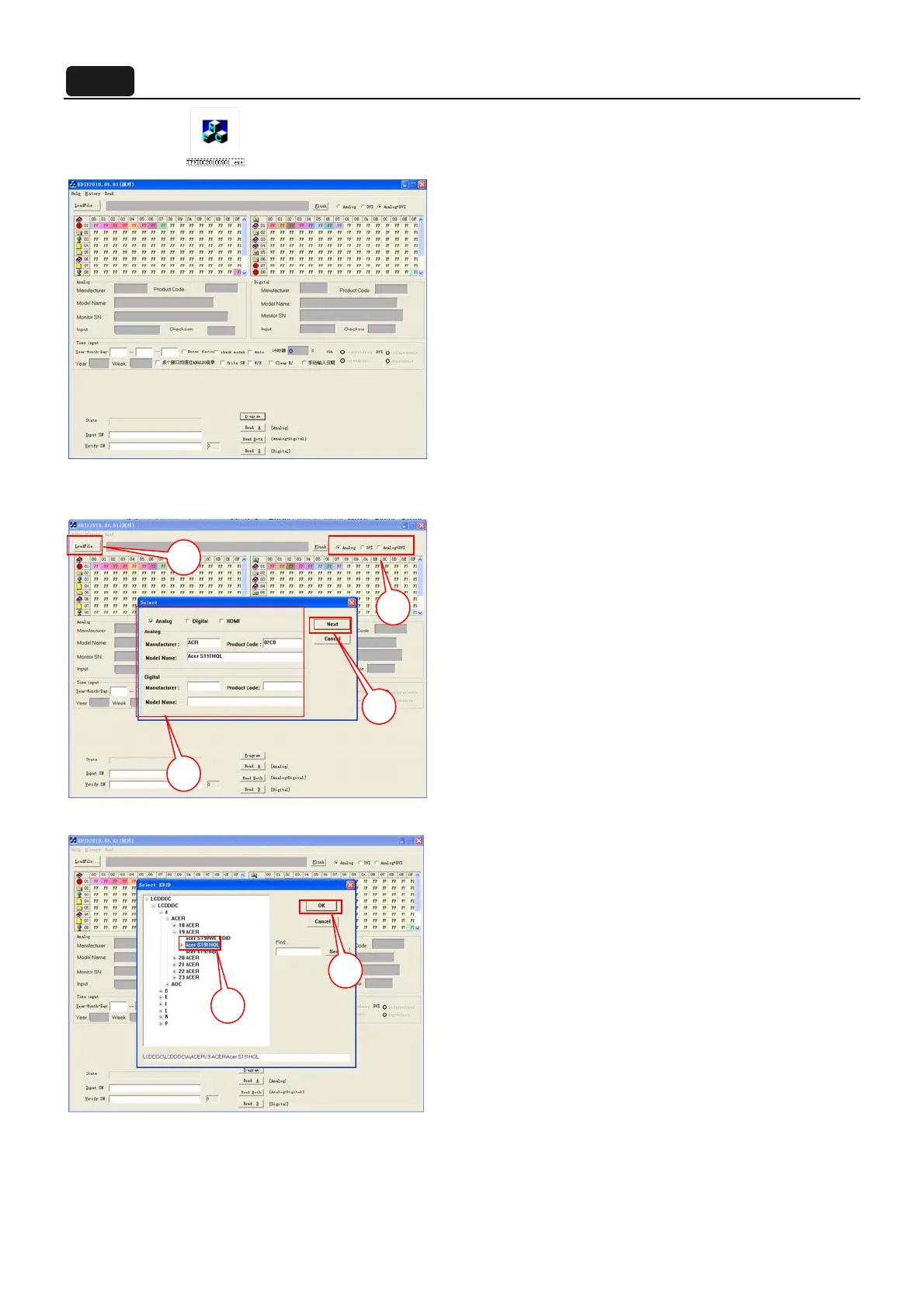 S6. Check the “Analog” and click “Loadfile” to set the parameters. Click “Analog”, Manufacturer: ACR, Product Code: