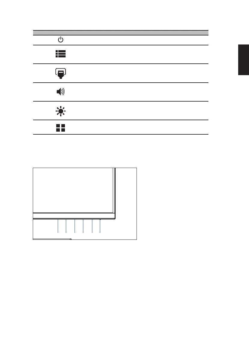 Turns the monitor on/off. Blue indicates power on. Blinking blue