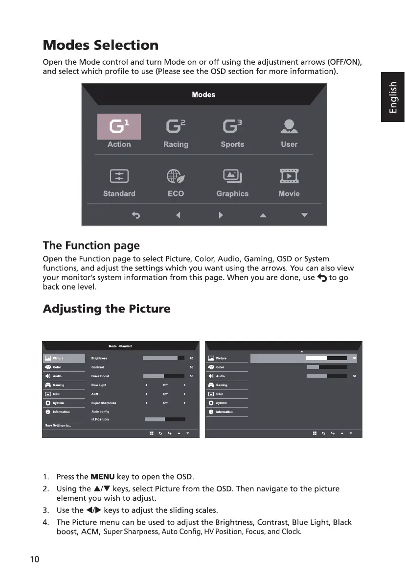 Acer SB220Q - Modes Selection; Adjusting the Picture Settings