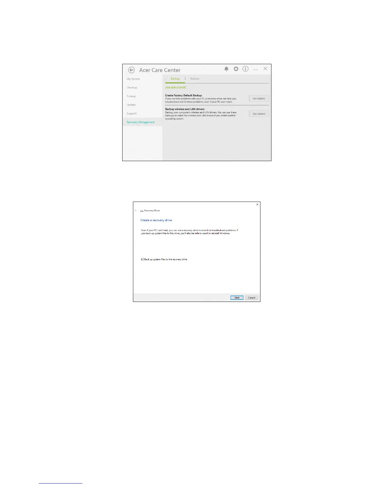 Default Backup to open the Recovery Drive window.