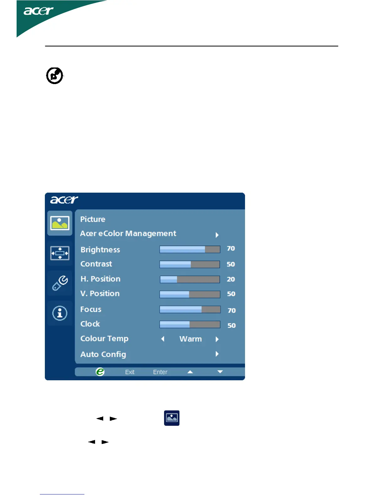 2Using the / keys, select Picture from the OSD. Then navigate to
