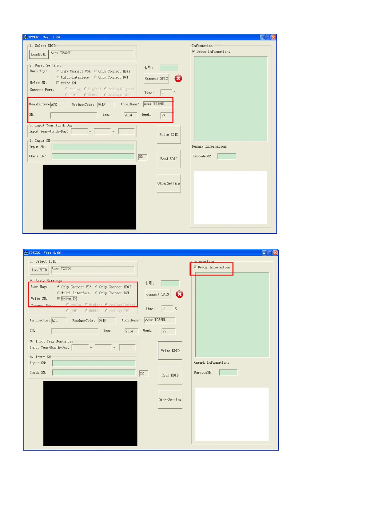 S4 Tick the “Only connect VGA”and “write SN”, then click “Debug Imformayion”.