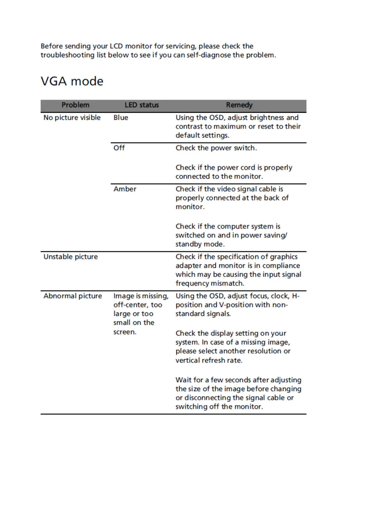 Acer T232HL - Troubleshooting Instructions; VGA Mode Display Issues
