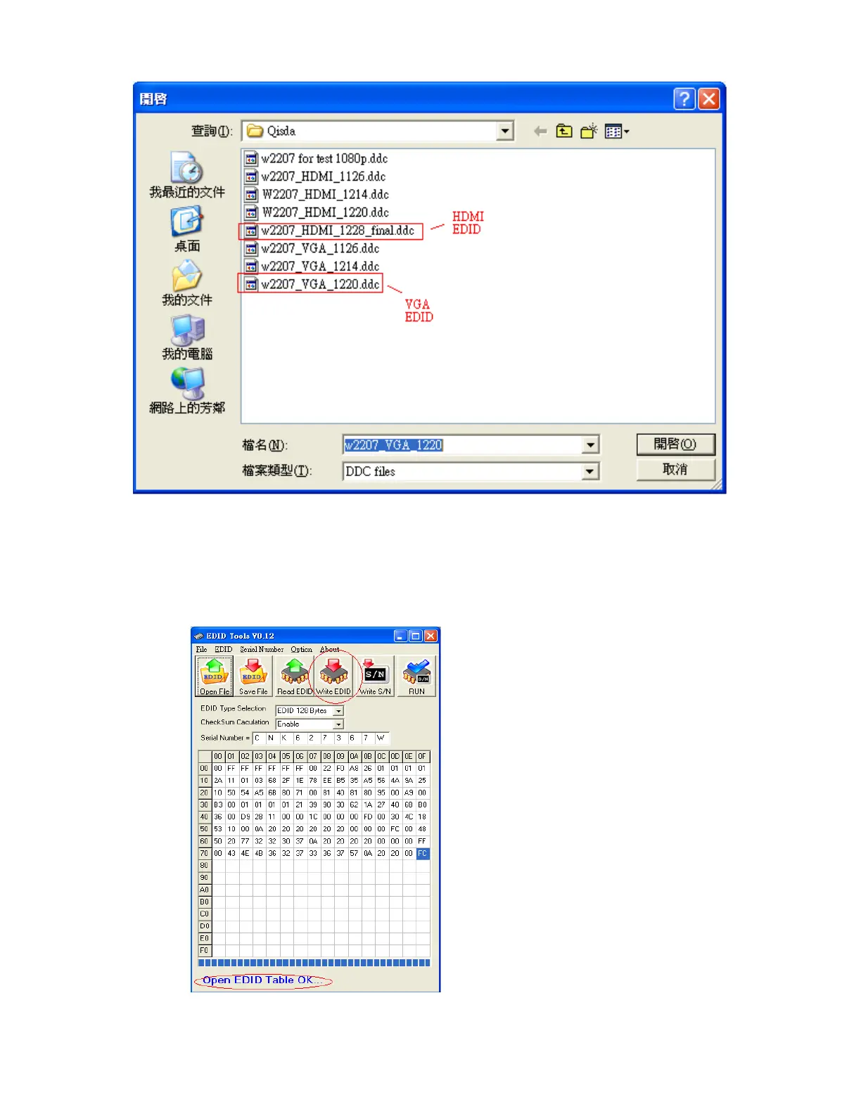 If load file is successful, it shows “Open EDID Table OK..”.