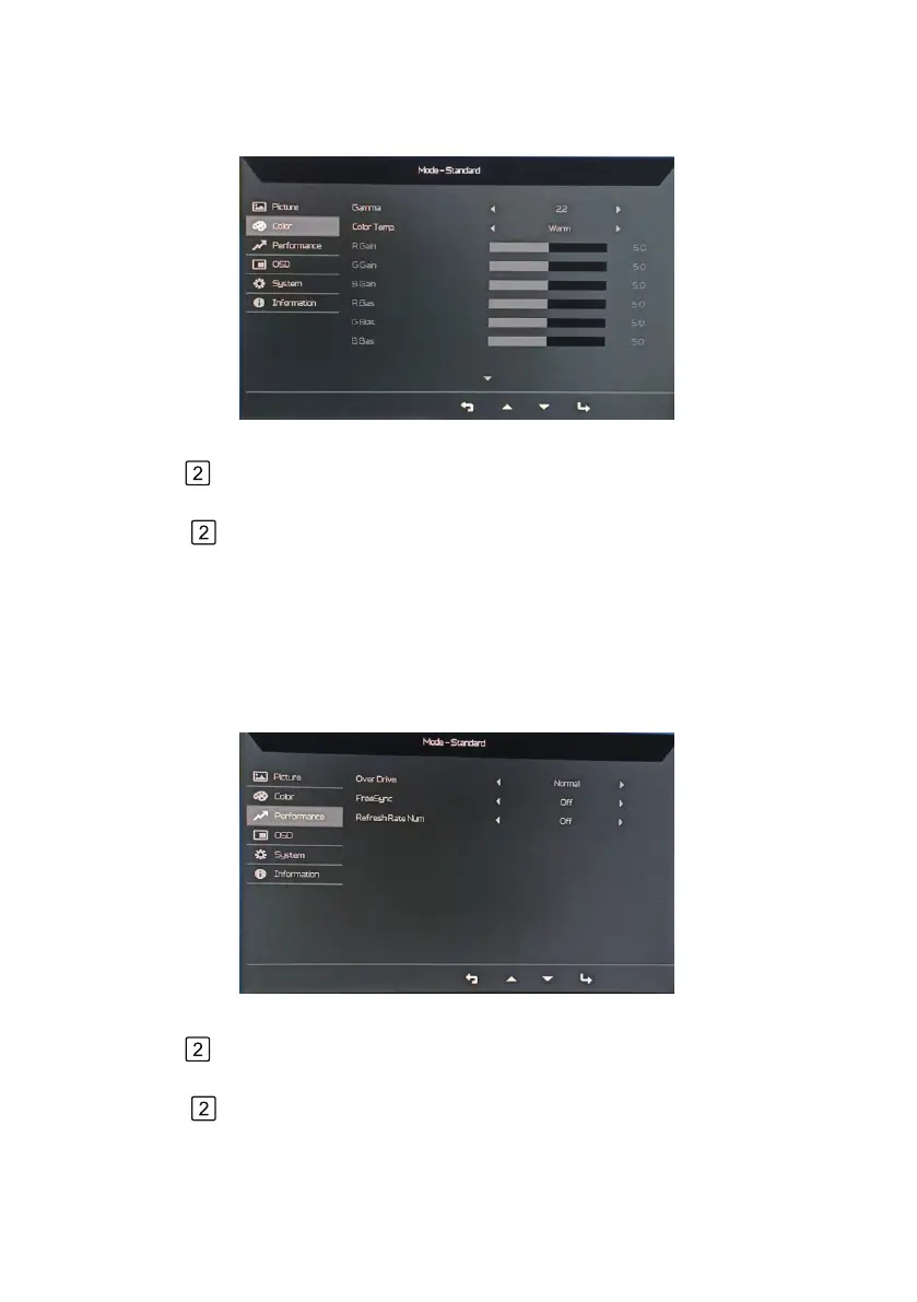 < / >keys to choose Gamma、Color Temp.、R Gain、G Gain、B Gain、R Bias、