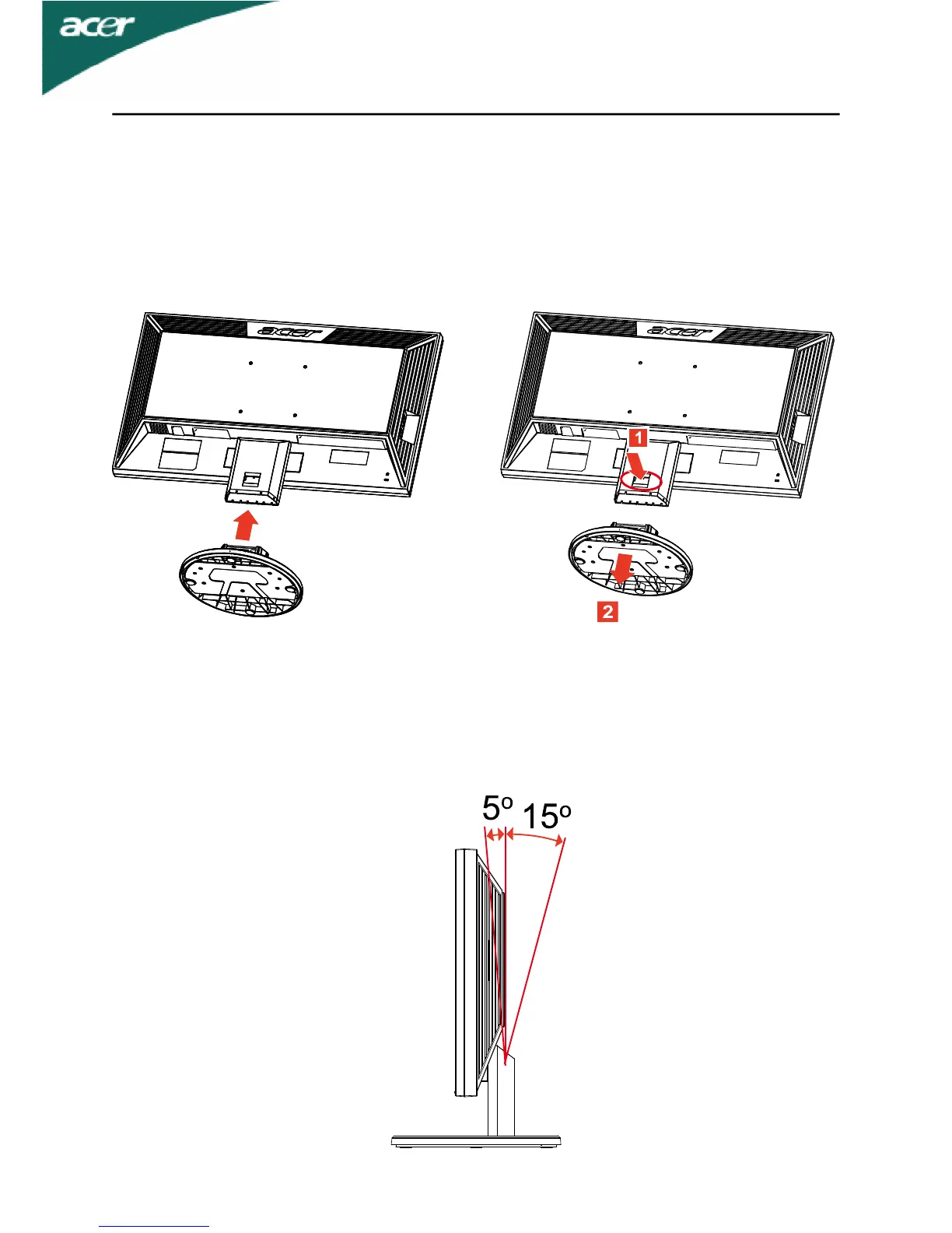 The monitor can be adjusted to 15 degrees up or 5 degrees down as indi-