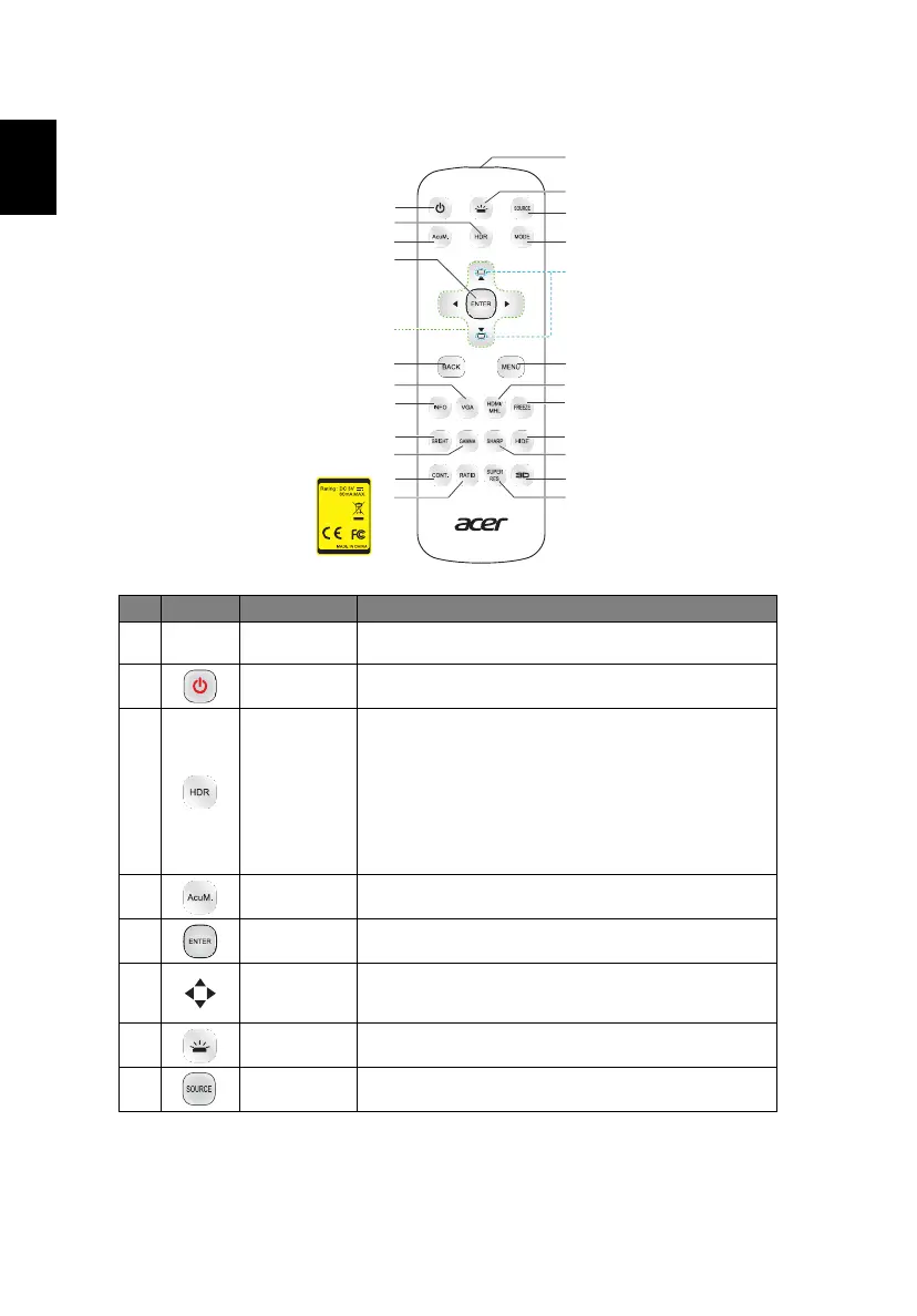 Acer V7850 - Remote Control Layout