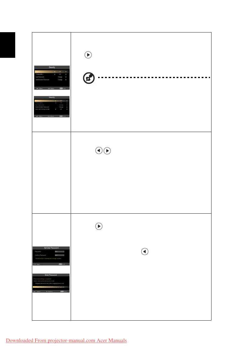 • Once the security function is enabled, the projector will