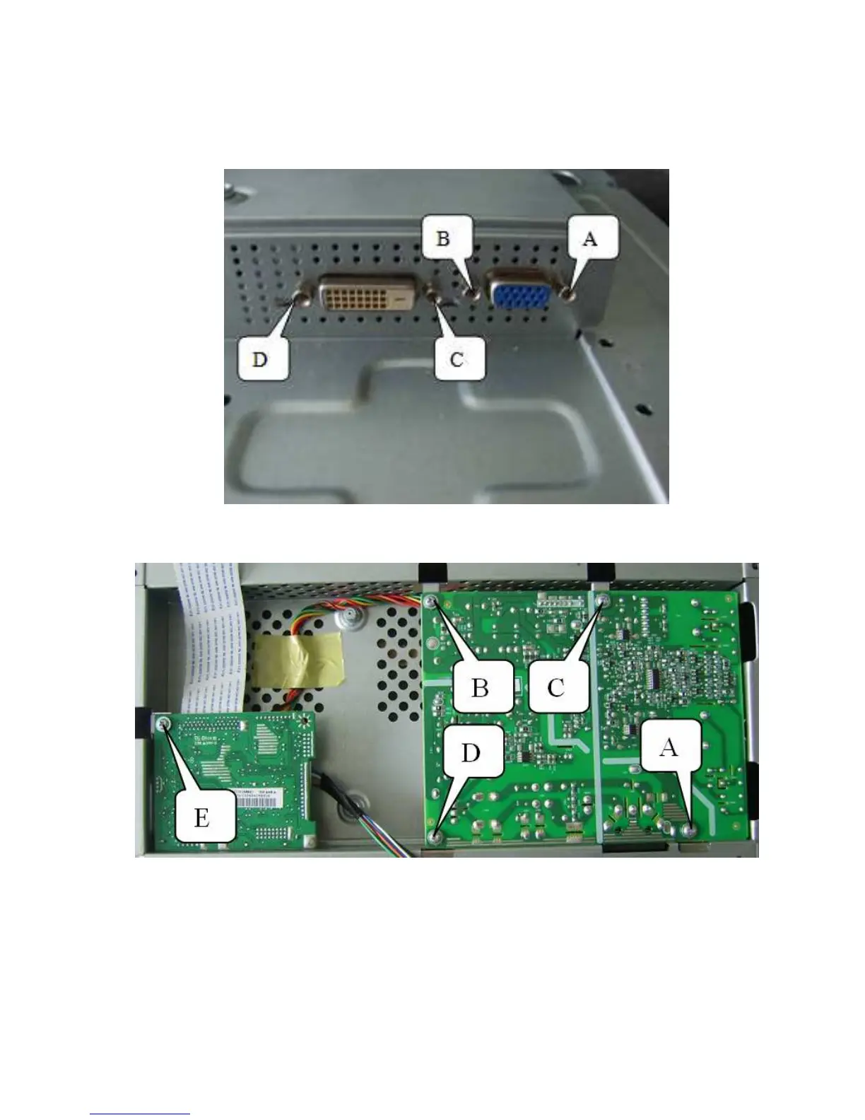7. Remove the screw as following indicate to remove the main board, audio board and power board. (Fig