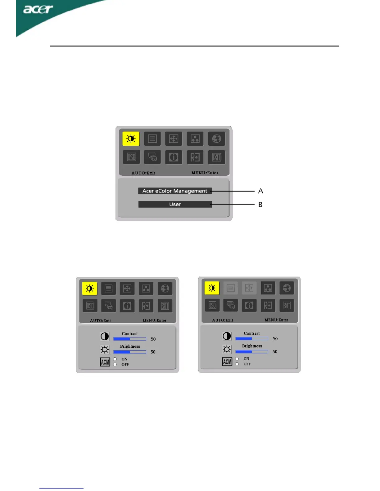 If selected to “Acer eColor Management” item, will appear the Acer eColor” OSD