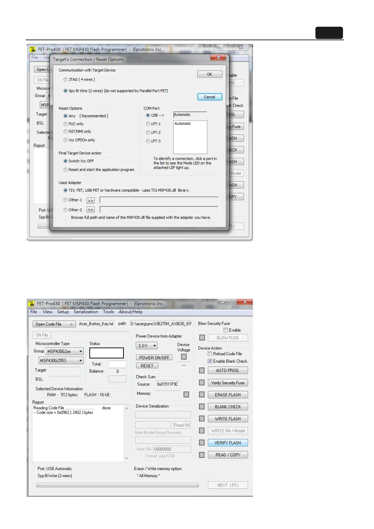 Make sure that the “Spy Bi Wire” communication with Target Devices is selected(and not “JTAG”). All other options