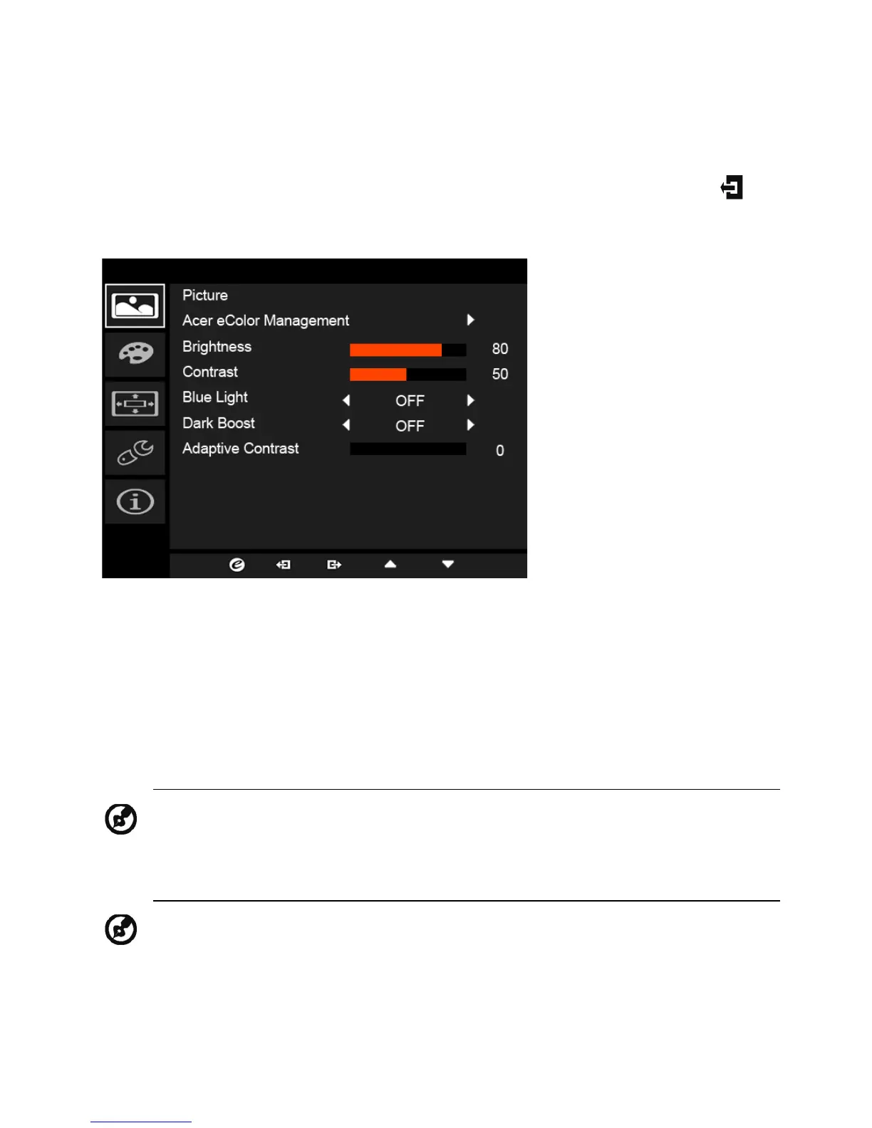 4. The Picture menu can be used to adjust the Acer eColor, Blue Light,