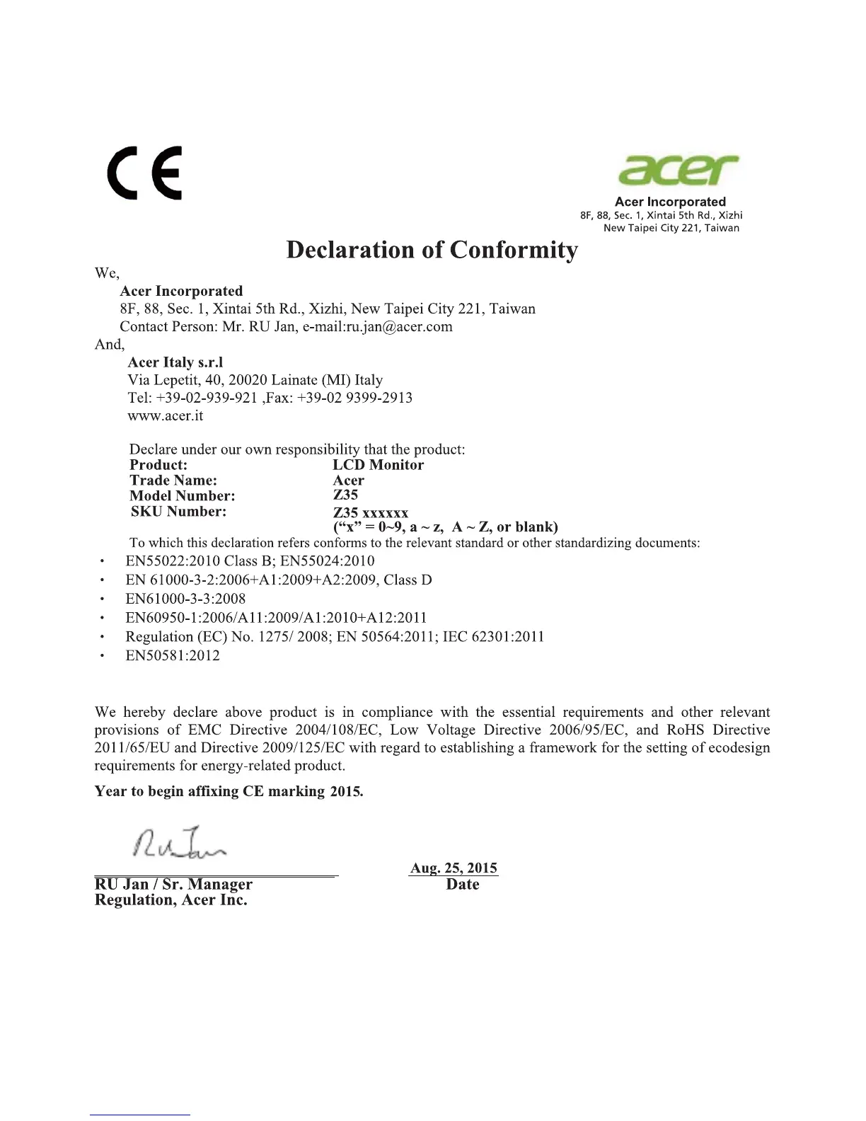 Acer Z35 - Regulatory Compliance (CE); CE Declaration of Conformity