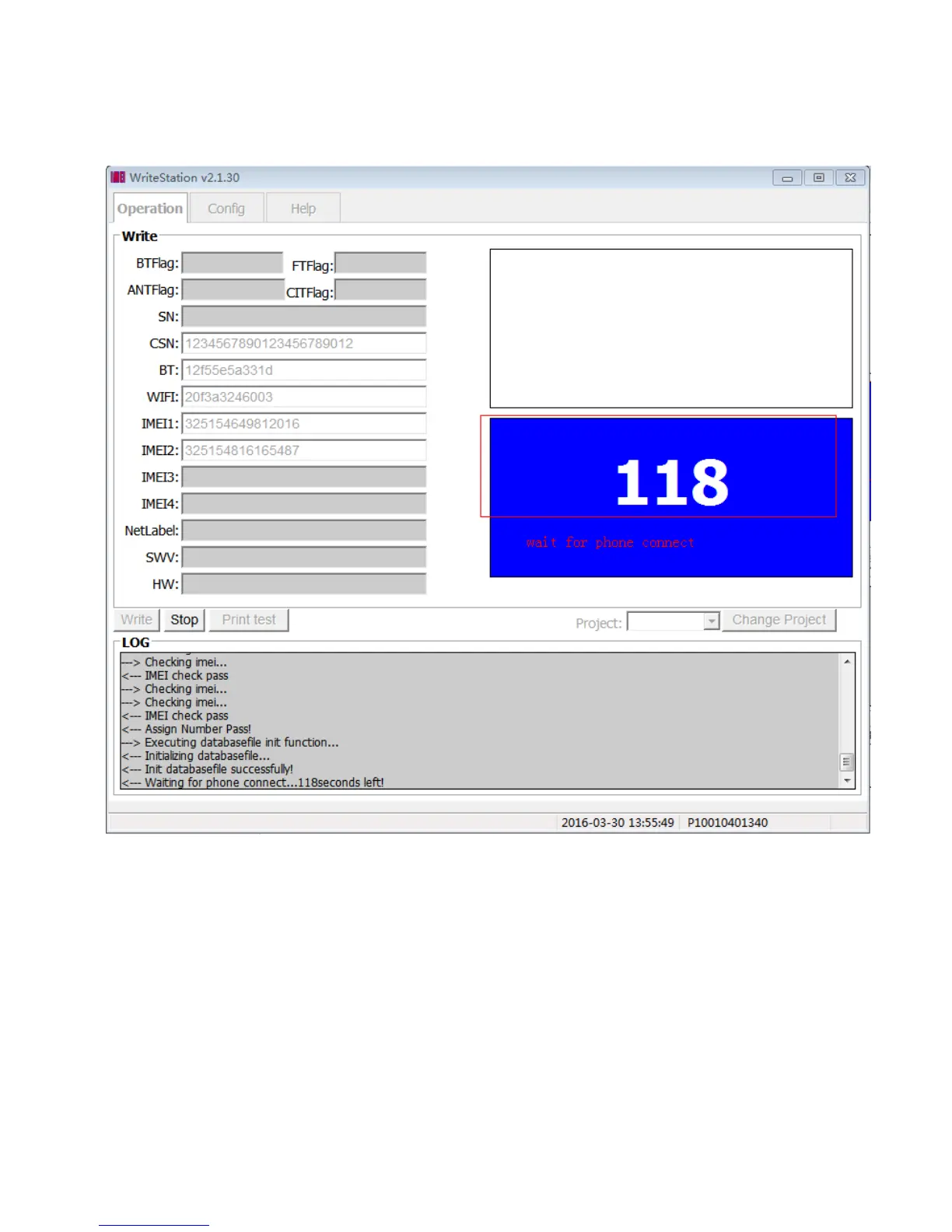 4.10 : Click “ Save” button,Then Change to “Operation” panel, and then input SN, BT, WIFI, and IMEI correctly,
