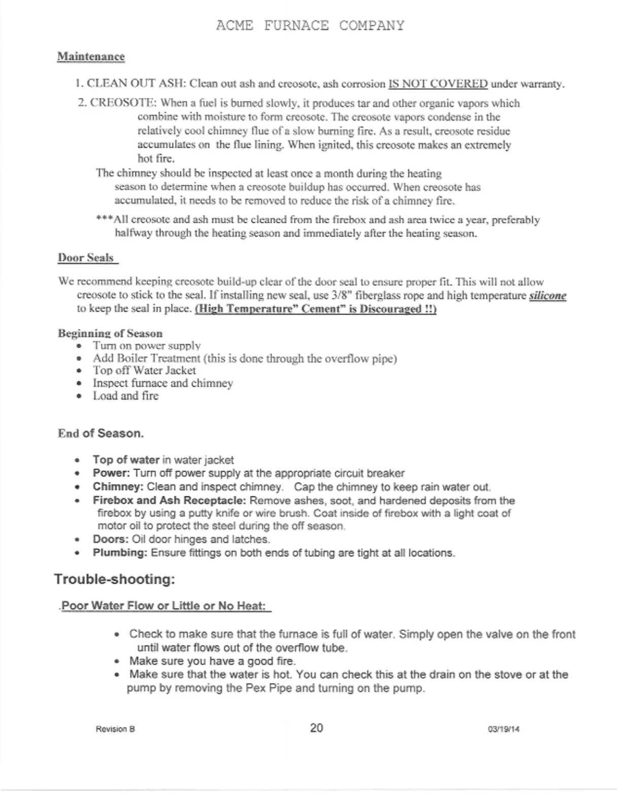 ACME 235 - Maintenance Procedures; Ash and Creosote Cleaning; Seasonal Maintenance Checklists; Troubleshooting Poor Heat or Water Flow