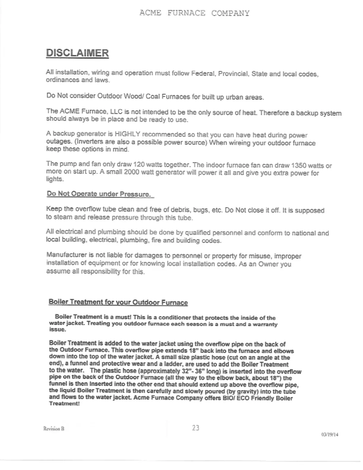 ACME 340 - DISCLAIMER; Operating Under Pressure Warning; Boiler Treatment Requirement