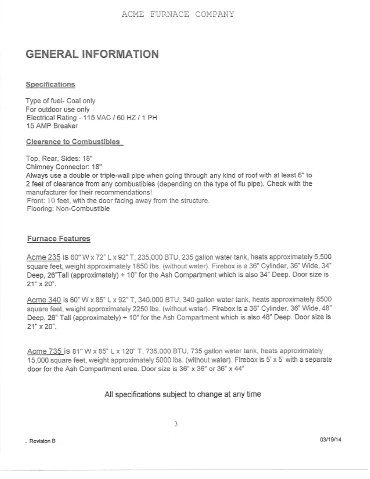 ACME 340 - GENERAL INFORMATION; Specifications; Clearance to Combustibles; Furnace Features