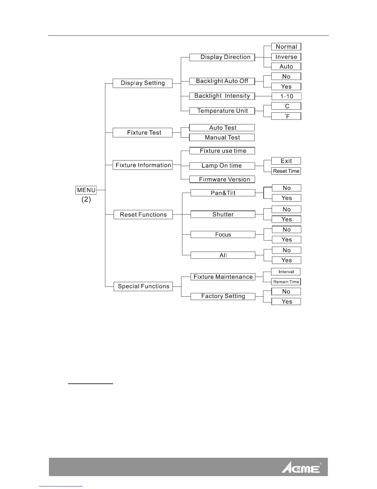 UP/DOWN button to select DMX Address, DMX Channel Mode, View DMX Value or