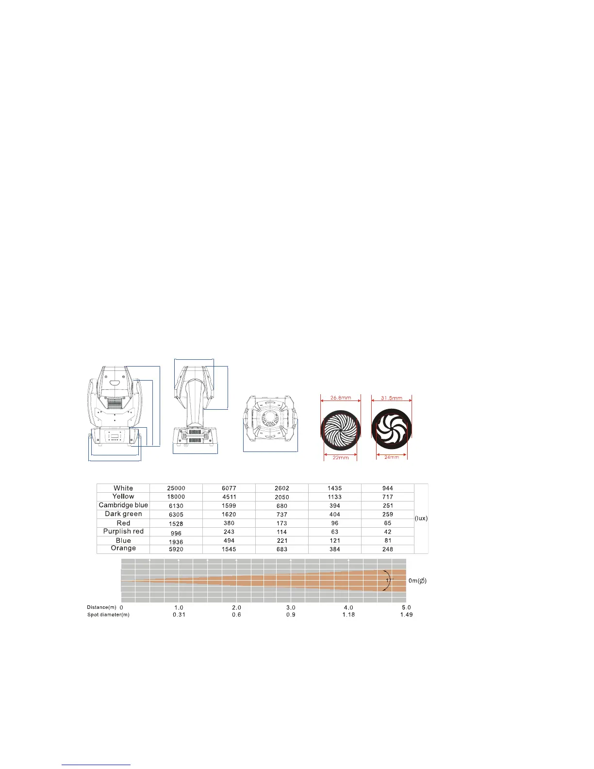 y Rotating gobo wheel with 7 gobos plus white, fixed gobo wheel with 8 gobos plus open.