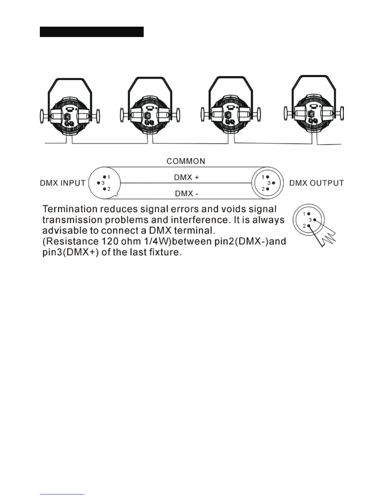 errors. Solder a 120-ohm 1/4W resistor between pin 2(DMX-) and pin 3(DMX+) into a