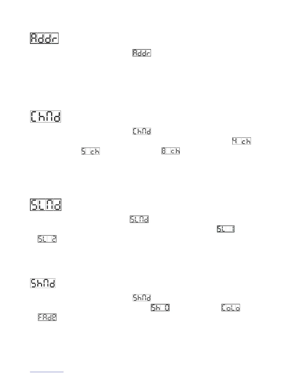 button and the display will blink. Use DOWN and UP button to change the DMX 512 address.