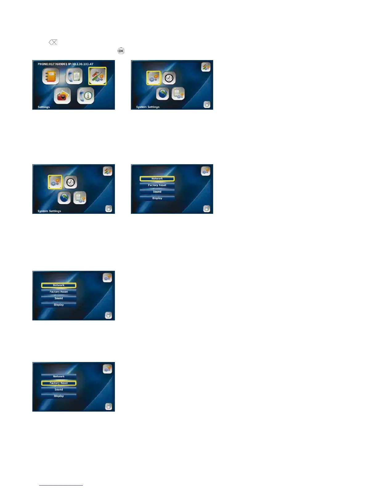 In this menu you can control the System, Time, Upgrade and Administrator settings for your Videophone. Always press the “Back”
