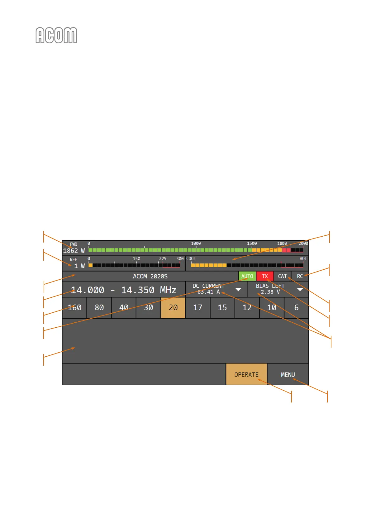 OPERATE / STANDBY mode and bands, selection of monitored parameters, as well as access to user settings