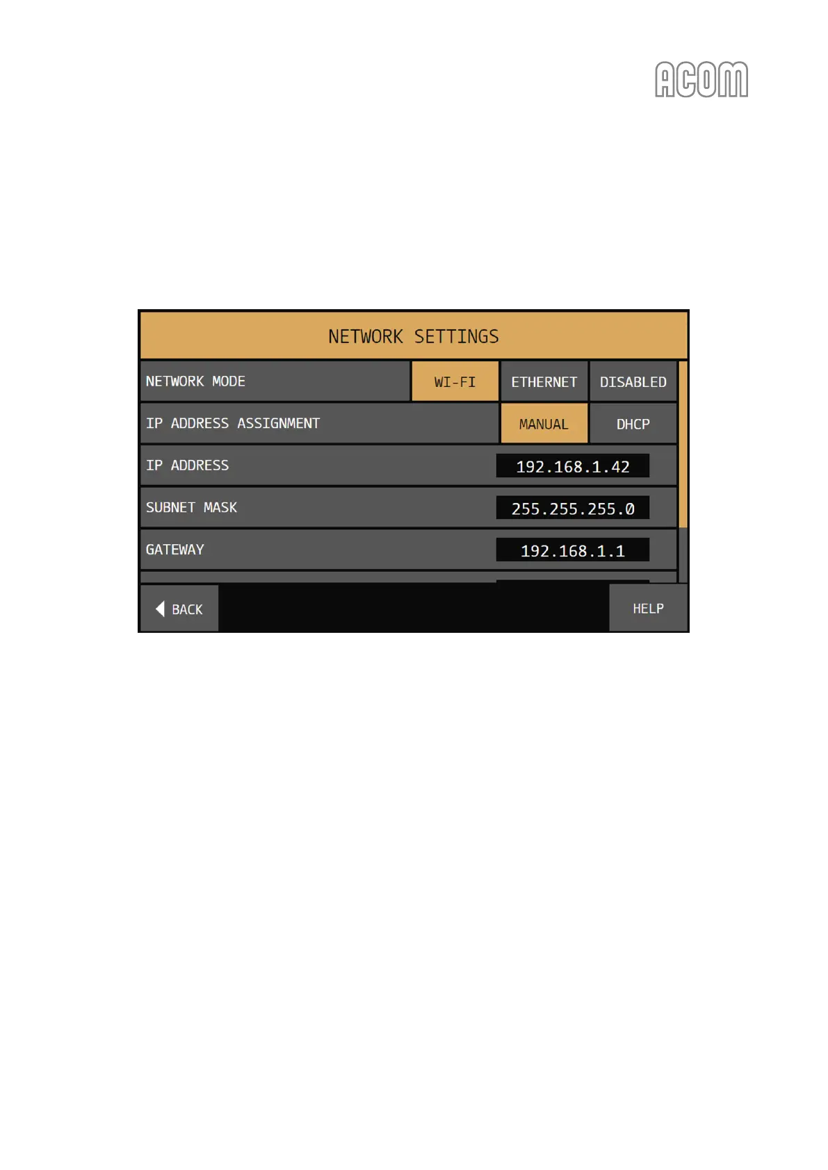 If MANUAL is selected, the fields IP ADDRESS, SUBNET MASK, GATEWAY and DNS are